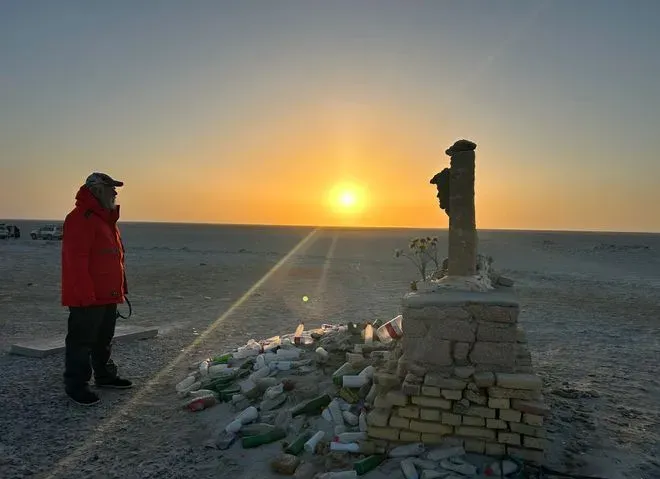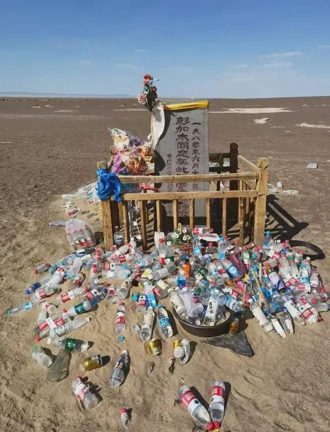 在罗布泊无人区深处的墓碑前追思故人