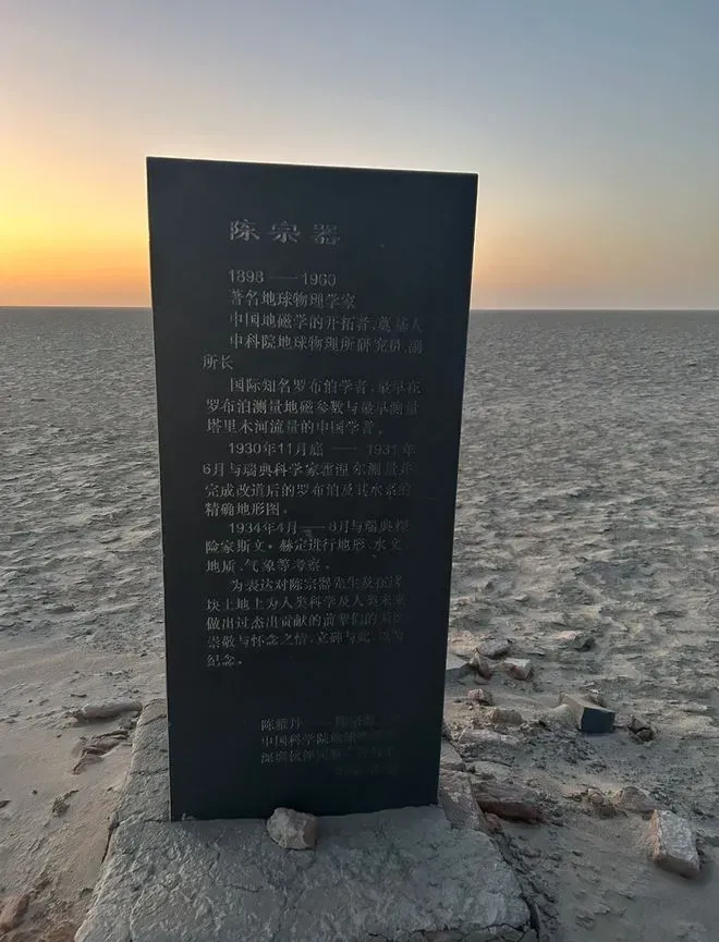 陈宗器,浙江新昌人,中国近现代著名地理学家、气象学家,中国地磁学奠基人,师从瑞典籍科学、探险家斯文赫定,后经斯文赫定资助前往柏林大学求学,建国后,为新中国地理学做出了卓越贡献,一生情系西北,女儿因此起名为陈雅丹,1960年逝世于北京,部分遗孤埋葬于其测定的罗布泊湖心处,立有陈宗器墓碑。