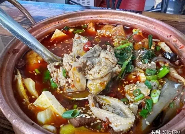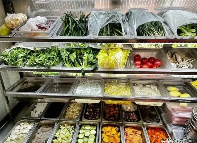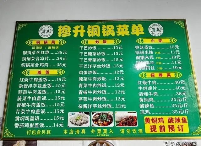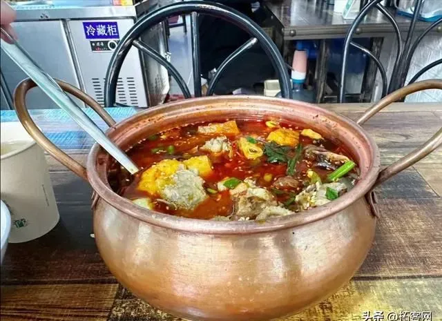 锅锅菜和麻辣烫类似,都是自助选各种菜,不过并不称重。和麻辣烫不同的是,锅锅菜是在一个小铜锅里煮,还要加上传统云南回民菜中经典的红烧、凉片或黄焖鸡作为帽子,然后配米饭吃。