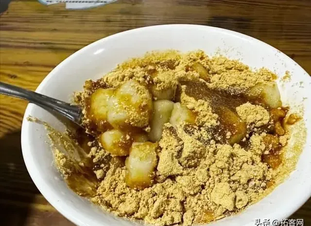 晚上在正阳时代广场的杜氏汤圆店吃牛打滚和干巴豆面咸汤圆。云南各种汤圆真的挺丰富的,甜咸都有。牛打滚就是把汤圆放在炒熟的黄豆面中翻滚,再加上糖稀或者玫瑰酱。他们家一直开到晚上,基本都是本地人来吃。