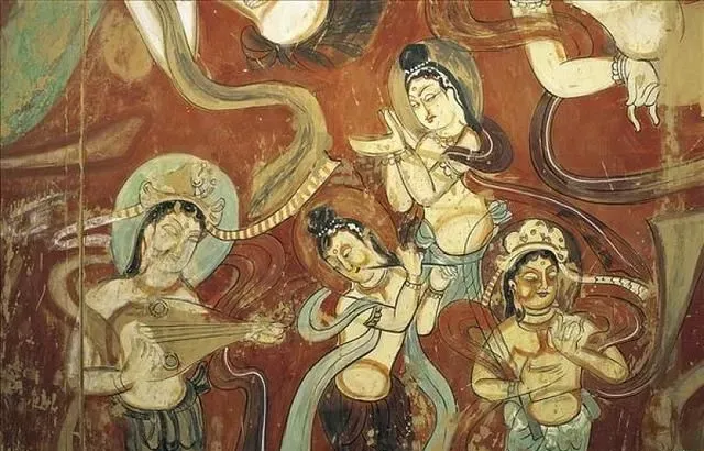 245号石窟,墙壁上画满了飞天女神。我抬头仰望,发现所有的飞天怀里都抱着琵琶。背景是迷茫的天空、云朵,虹影在那里幻现,白鸽伸开翅膀,在佛光中飞翔。琵琶弦上的歌谣喑哑了,《阳关三叠》的乐音早跌落在沙漠,变成一片死寂,一片空茫。一千年的日升月落,一千年的风沙漫漫,一千年的开启闭合,曼陀罗花已经凋落,古莲子也不再发芽。