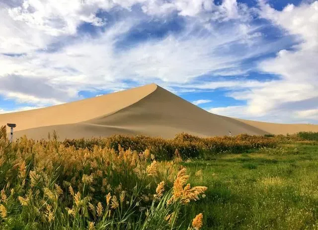 月牙泉蓝蓝的,静静的。岸边的芦苇挑着璎珞似的穗子,在晚风里摇晃,雪白的花朵漫天飞扬。