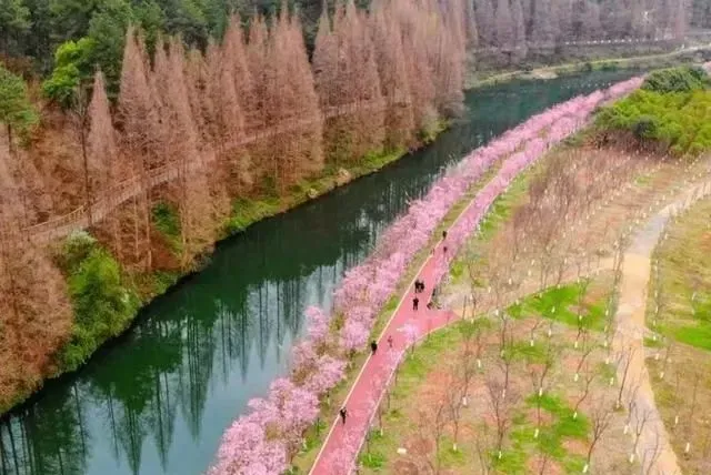 “至美大陈”樱花浪漫精品线游步道、骑行道、木栈道全线贯穿,60余处景观小品分布有序,沿线8000株樱花、1000棵紫藤、10万平米绿地、2000亩猕猴桃构成了十里浪漫长廊。