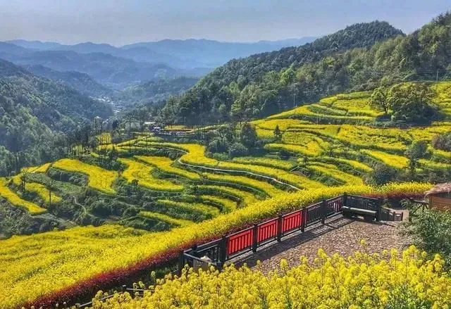 春日的浦江民生村,是一个由油菜花构建而成的彩色王国,千亩花田竞相盛开,不单单只有乏味的金黄,更多的是山野阔达的风光。漫山遍野的油菜花,充满着山野闲趣,仰俯之间,皆是绚烂一片。这个秀美迷人的小山村淹没在油菜花海中,真的犹如一颗璀璨的明珠,艳丽整个春天。被评为全国十大任性油菜花基地之一。