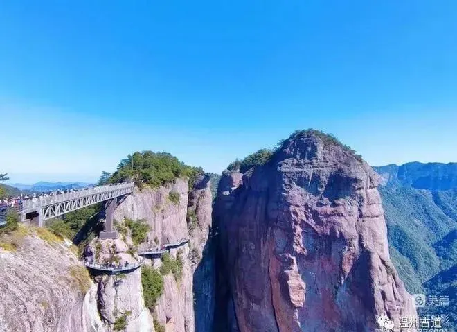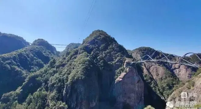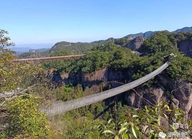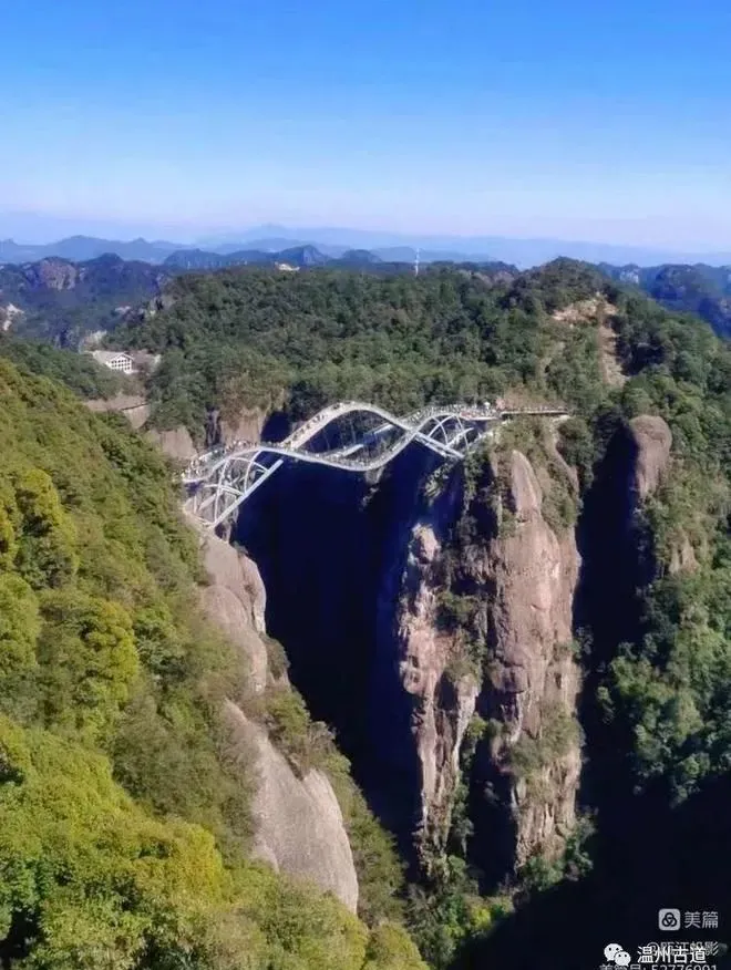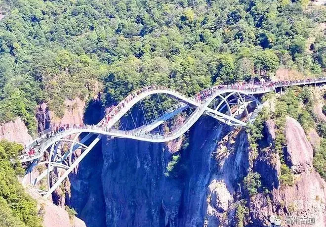 如意桥是神仙居最火爆的网红桥,横看犹如几条交织飘逸的绸带,俯视又若一把玉如意,横空凌架于百米峡谷之间,惊险万分。