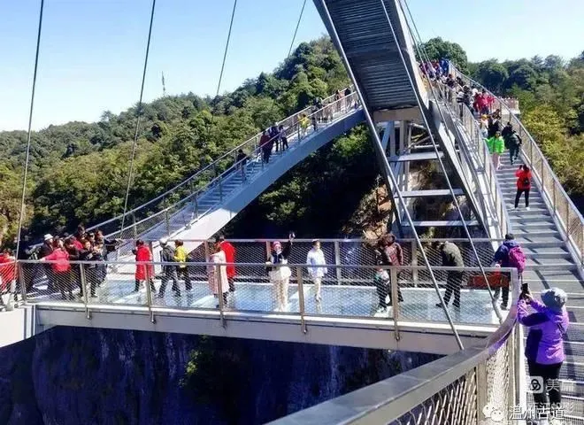 两侧镂空的栈道,由铁栅栏铺设而成,桥心为全透明玻璃桥,中央为实心拱桥。行走上面非常稳当,并无摇晃之感,但这也足以令人心跳加速,刺激不已。立于桥上,能遥望远处的“一帆风顺”,意境深远。