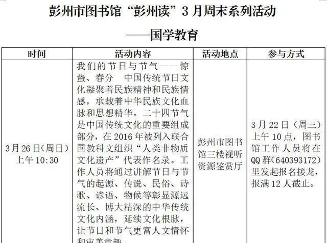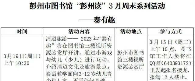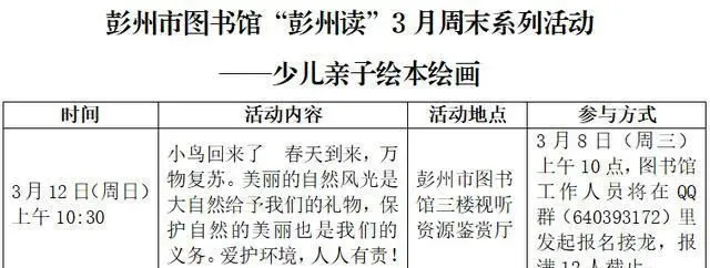▶ 彭州市图书馆“彭州读”3月周末活动预告