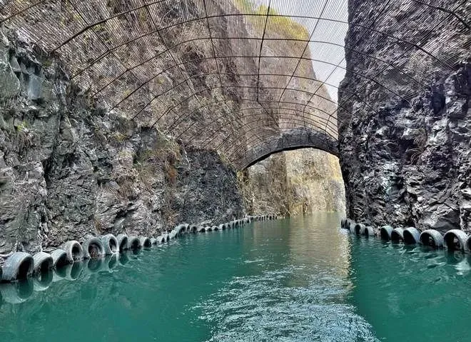 因为是用曾经废弃的矿坑打造的生态乐园,所以来到章氏矿坑冰城首先就需要去体验一下自己开船探索采矿遗留的人工水道,穿行其中仿佛就像是行走在小三峡之中,两侧是雄壮的峡谷,身旁是碧绿碧绿的湖水。