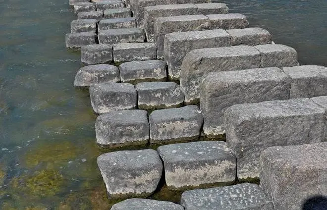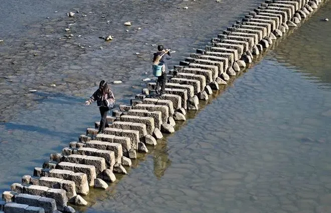 仕水碇步石桥由两块平整的条石砌成,平行分高低二级,高低错落形成了如同钢琴般的美妙质感。