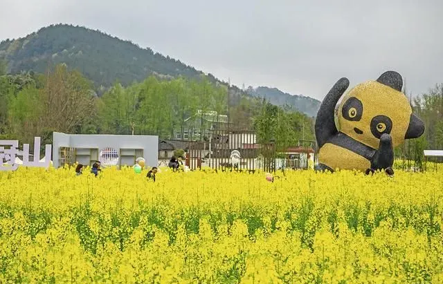 近的是一大片花田,每一朵油菜花攒足了劲,在你的身边争宠,并散发着清香,引得小蜜蜂飞来又飞去。远的是熊猫雕塑,竹子网红打卡点,白墙黑瓦的农舍,黄颜色的菜花,花的海洋,金色的世界,俯视与航拍效果极为震撼。