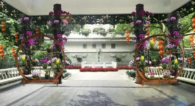 以各色兰花为载体,以云潺、九龙泉牌坊、九龙泉为重点展示区域,设置艺术构架,组合兰花,各色时花等。
