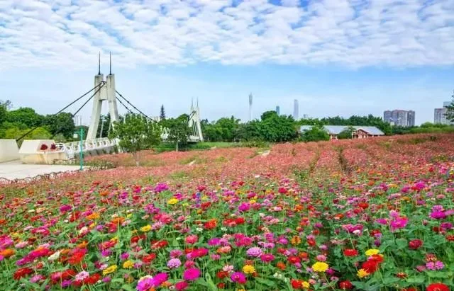 海珠湖·花畔塔影内近1.4万平方米的波斯菊,五彩斑斓的花海随风起舞、婀娜多姿~