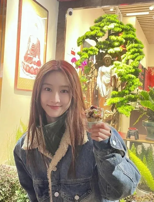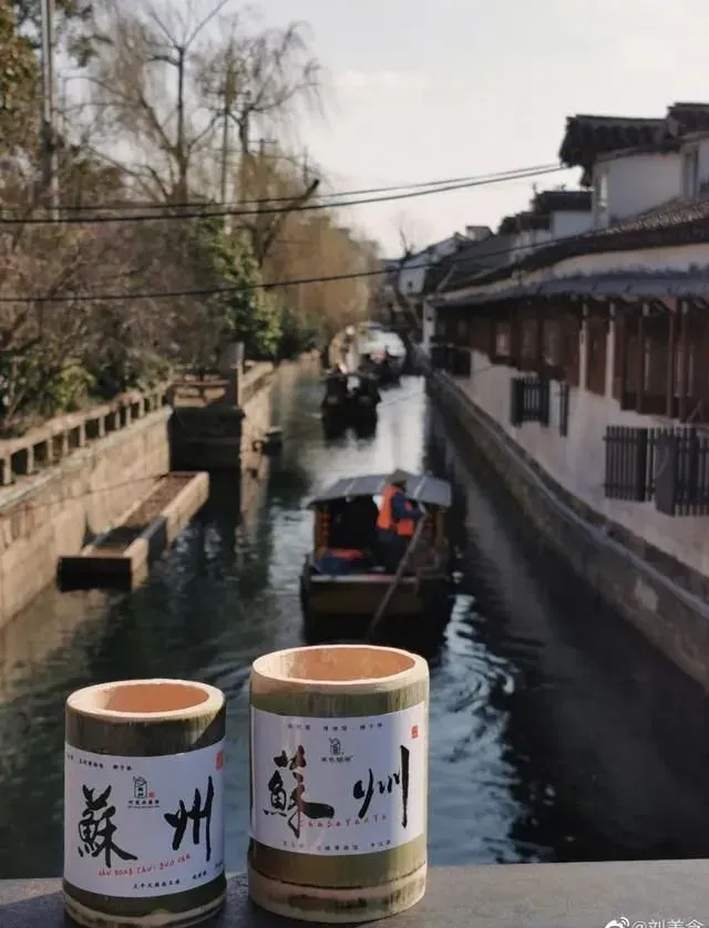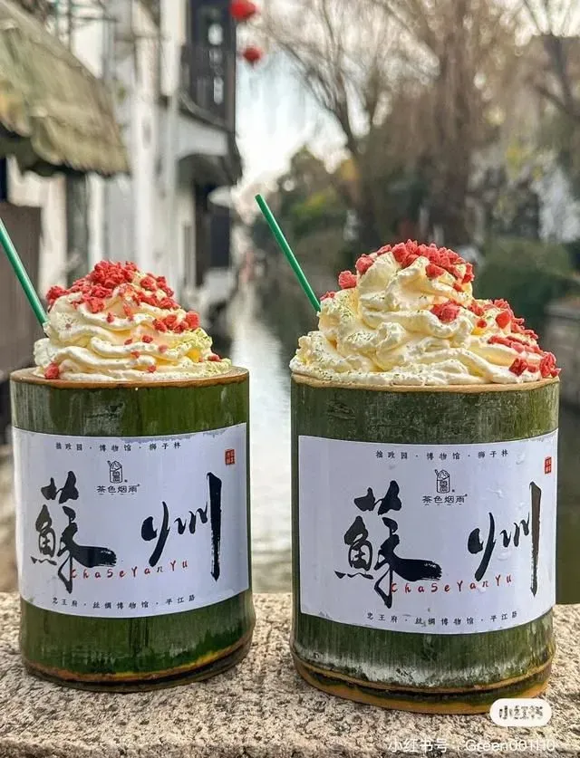 刘美含这次还打卡了一些网红小店,像是【茶色烟雨】,竹筒的杯身拿在手里就很有韵味。层层堆叠的奶油顶上撒着些许草莓冻干,抿一口奶香清幽,在唇齿间回甘。红白绿的颜色搭配还蛮符合江南意境的。