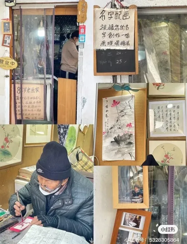 主街上有不少当地的特色小店,有八九十岁的老师傅手写书法、手绘国画艺术,一幅幅都是水墨色的江南。里面还有一家可以定制书签的书画工作室,84岁的夏爷爷会根据每个人的名字再配上祝福语绘制出独一无二的书签,很有纪念意义,送给朋友也是很有心意。