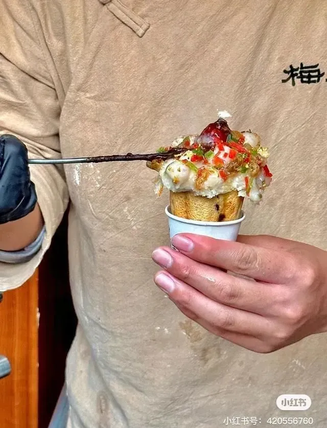 梅花糕里塞满着红豆和糯米,上面还有小丸子,出锅时再撒上一把干桂花,热气腾腾的,糯叽叽星人必尝试。