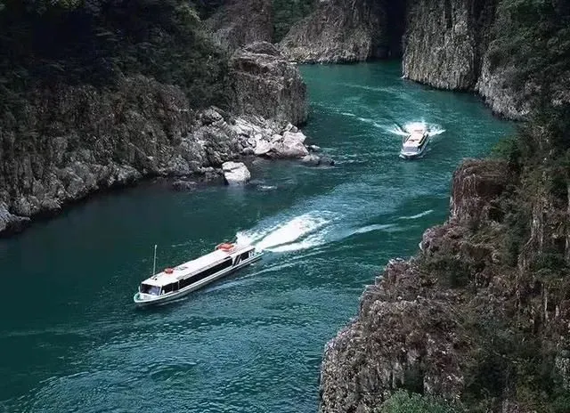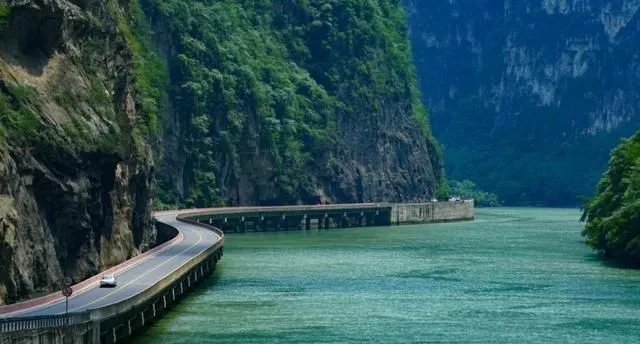 峡谷两岸奇峰突起,危岩耸立,形成山环水绕、山水同天的迷人景象,飞驰在大渡河上的水上公路,壮阔感油然而生。