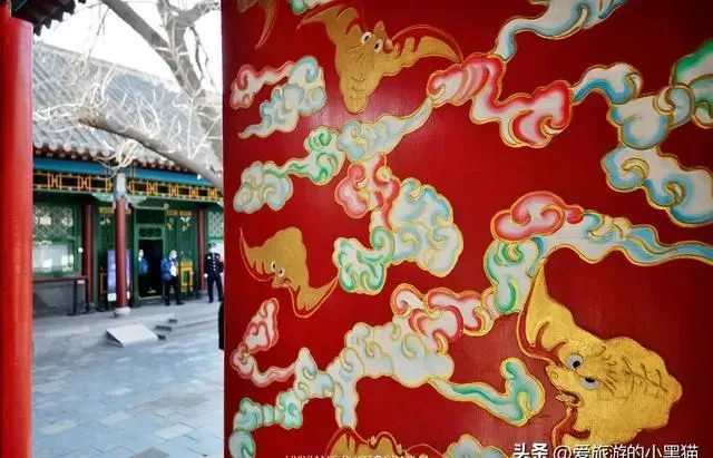大政殿内有八根十余米高的彩绘金龙大柱直插殿顶,穹顶正中是圆形的木雕金漆降龙藻井,周围的天花彩画,靠里侧的是万福万寿万禄万喜八个篆书汉字图案,靠外侧的是梵文字图案和龙凤图案。