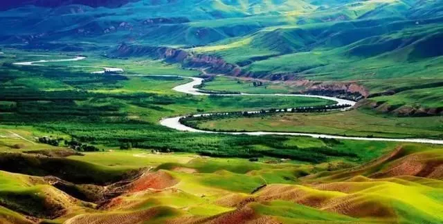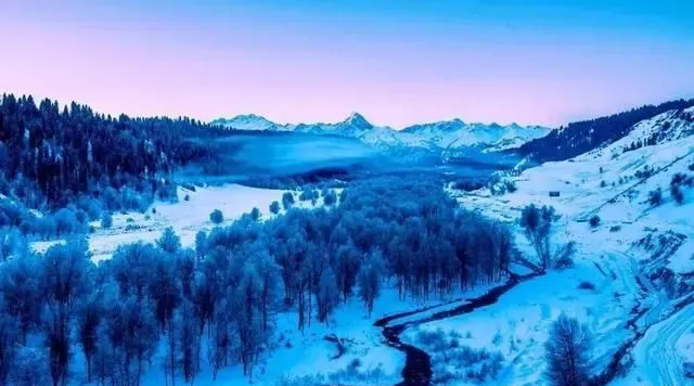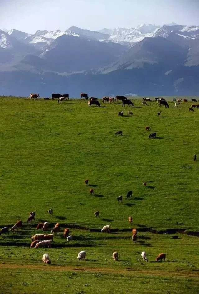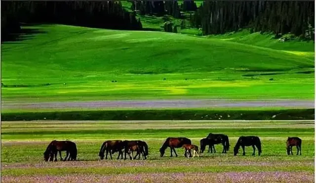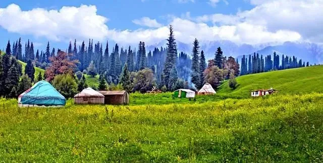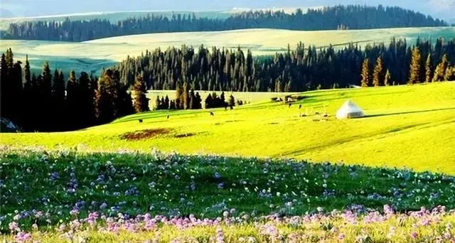 山峦起伏跌宕,生长着茂密的雪岭云杉,苍苍莽莽。繁花似锦,坡麓平缓,无垠无际,恰似一幅美妙的碧色地毯,一直铺到冰雪皑皑的高山脚下,令人心旷神怡。