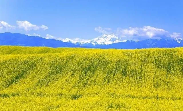 每年6月底前后,漫无边际的油菜花犹如一条条金色的织毯,席卷着广袤无垠的昭苏大草原,与天山遥相辉映。