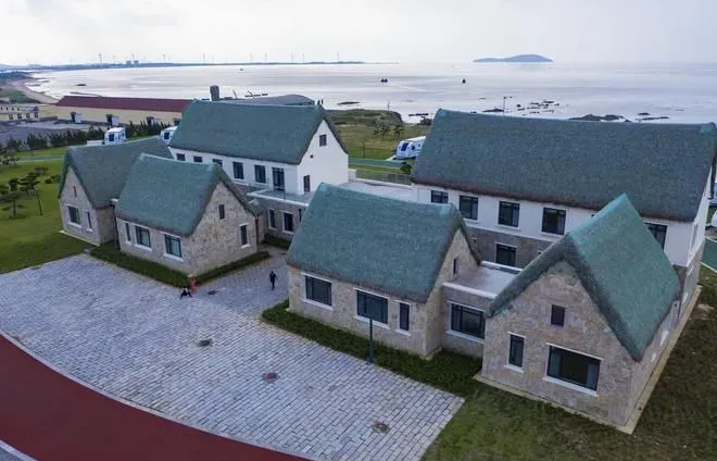 在威海最自由的感觉,就是自驾环海公路,沿途碧海蓝天、绿树红瓦,随便停靠就是一处风景,沿海的风车,迎风转动,而海草房,更像安徒生童话里的蘑菇房子。