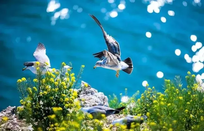 隔海望去,花团锦簇,一群群海鸥往来盘旋;