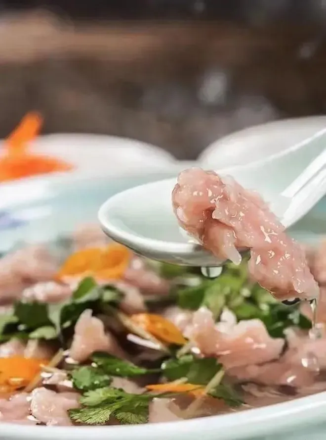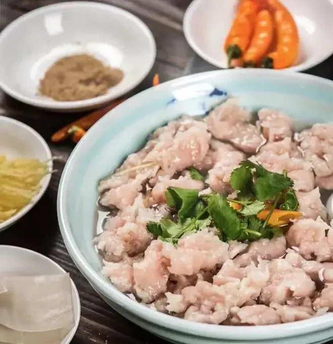 说起福鼎肉片,几乎无人不知,甚至成了福鼎的一块招牌。福鼎肉片必须是猪后腿精肉作食材,刀剁切到细泥,棒打手揉至软糯筋弹,在盛汤前的碗里加上些许香菜,将煮熟的肉片和汤倒入碗中,这时整碗肉片的香辣中流露出淡淡的香菜之味。吃上一碗刚出锅的肉片,暖了身子,饱了肚子。