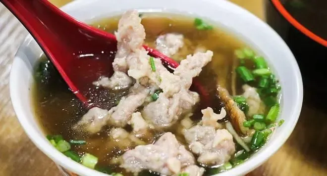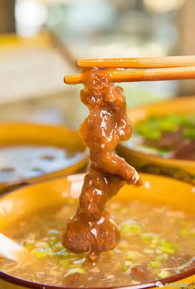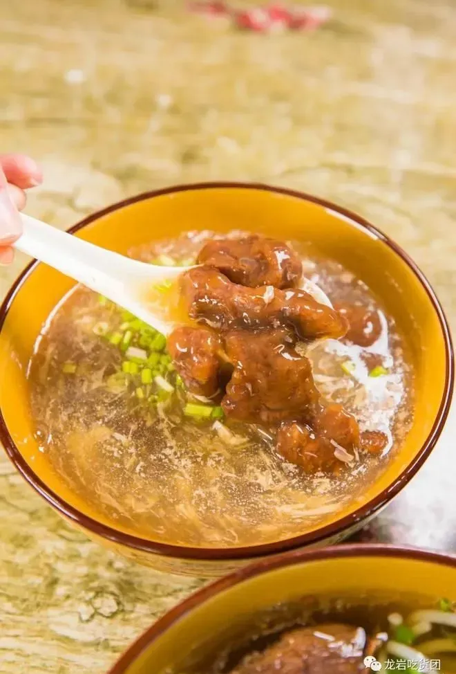 “兜”在客家话中是“端”的意思,兜汤,也就是端着喝的汤。牛肉兜汤的牛肉在经过反复的揉打之后,被裹上了一层晶莹剔透的“衣服”,变得Q弹十足,胡椒粉的香味把原本浓稠的汤烘托得更热烈,大口咀嚼滑嫩鲜美的牛肉,再配上一勺微辣辛香的汤底,一整天,心里都热腾腾的。