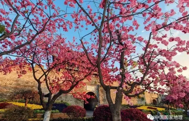 樱花是大理除苍山洱海的另一景,每年11月中旬至翌年3月,大理古城街道两旁的樱花在冬日的暖阳下竞相怒放。盛开的樱花灿若云霞、分外妖娆,幽香沁人。除了古城,大理学院和无量山也是观赏樱花的绝佳去处。图为樱花掩映的大理古城南门。摄影 / 谢罡