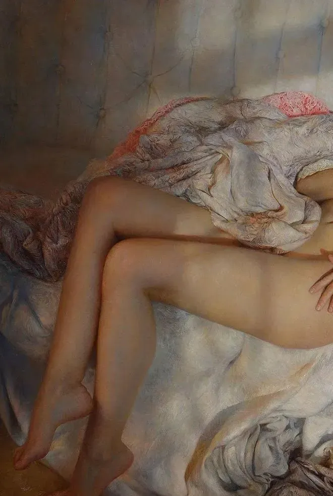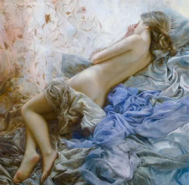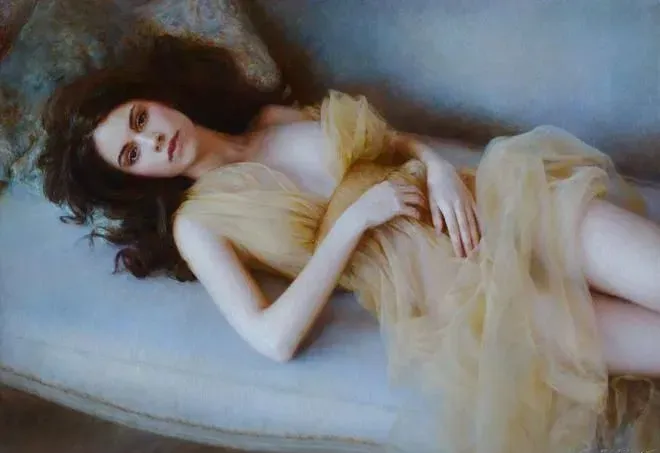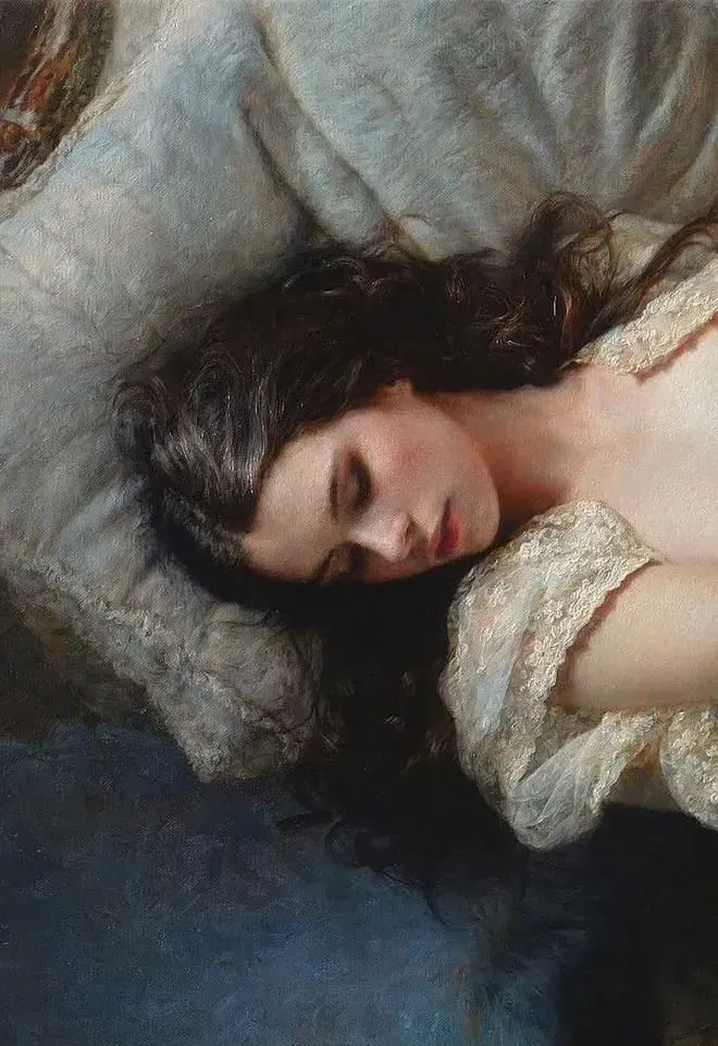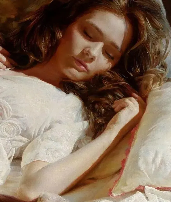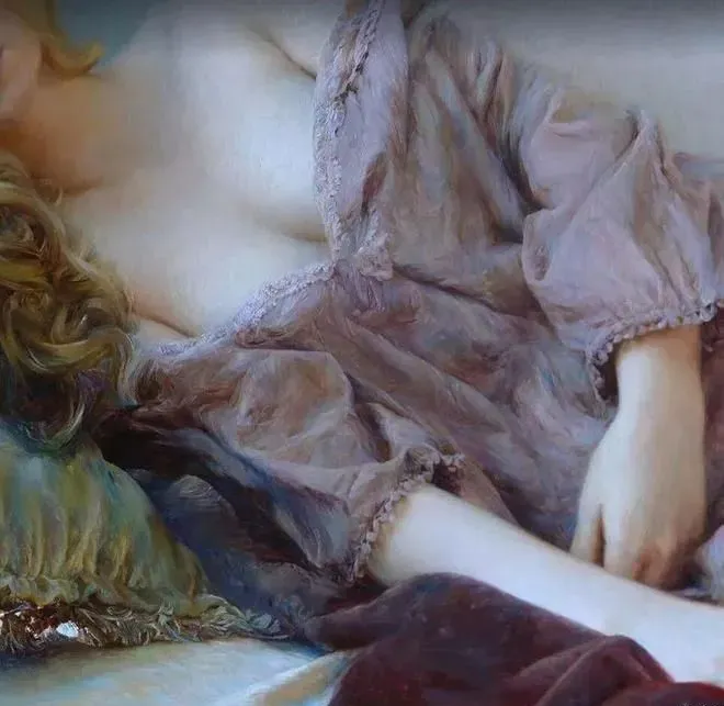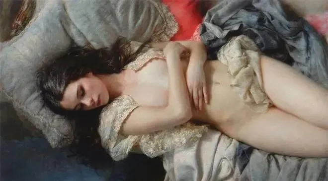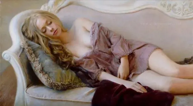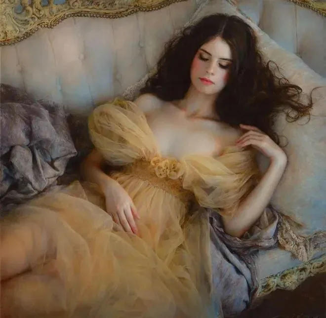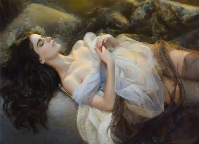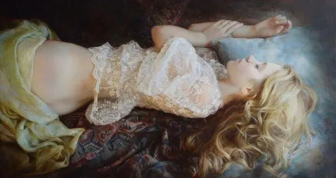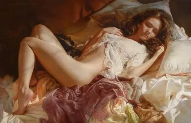 看到上面的这幅油画作品后,相信大家也被画中的女子所吸引吧?只见画中的女子静静的侧躺在床上,一头乌黑的头发,穿着一身蕾丝的睡裙,这种风格一看就是俄罗斯的女孩风格。
