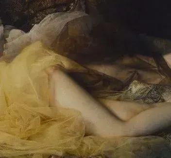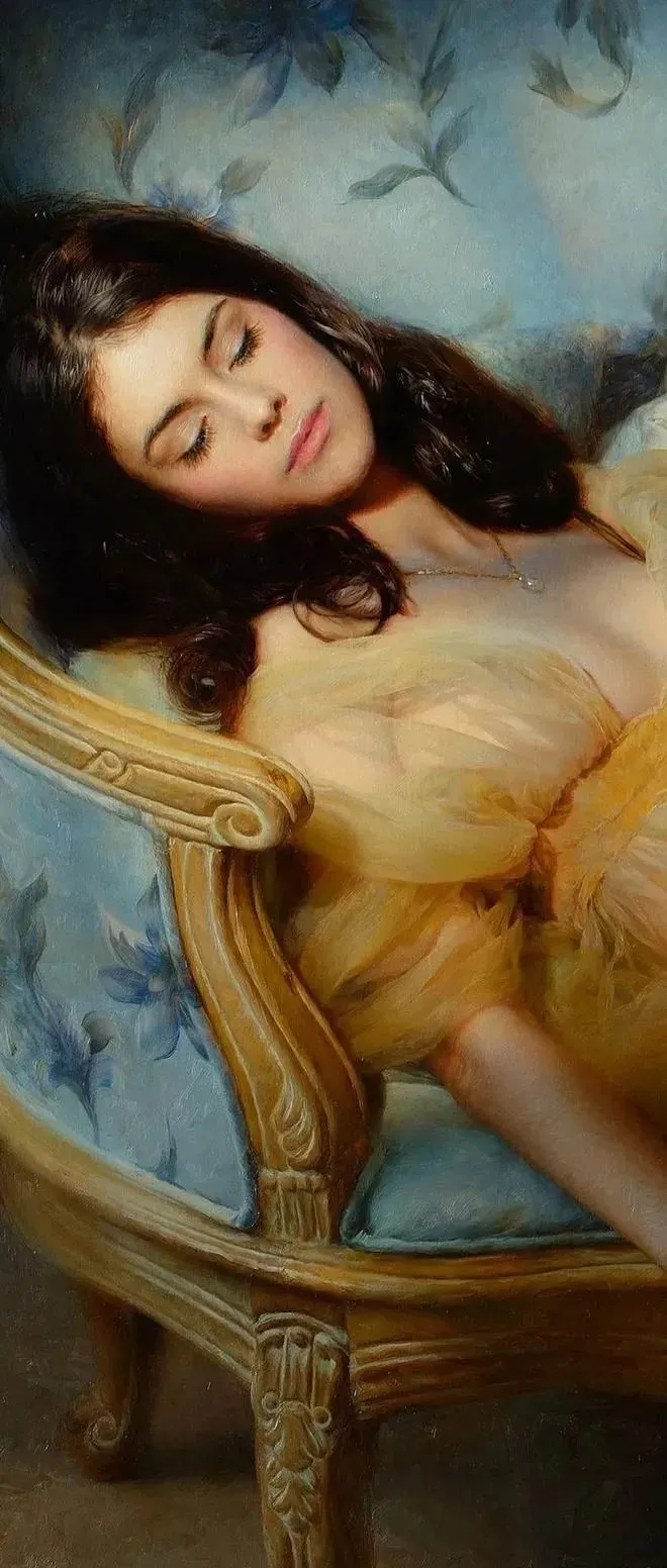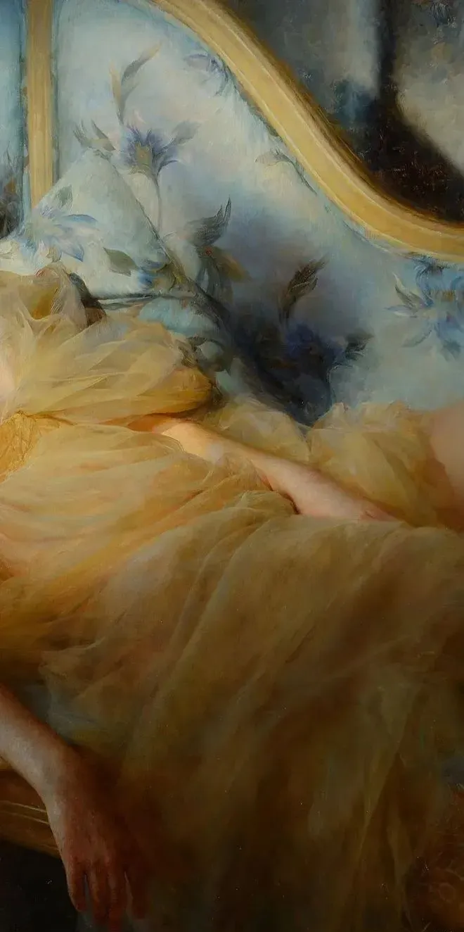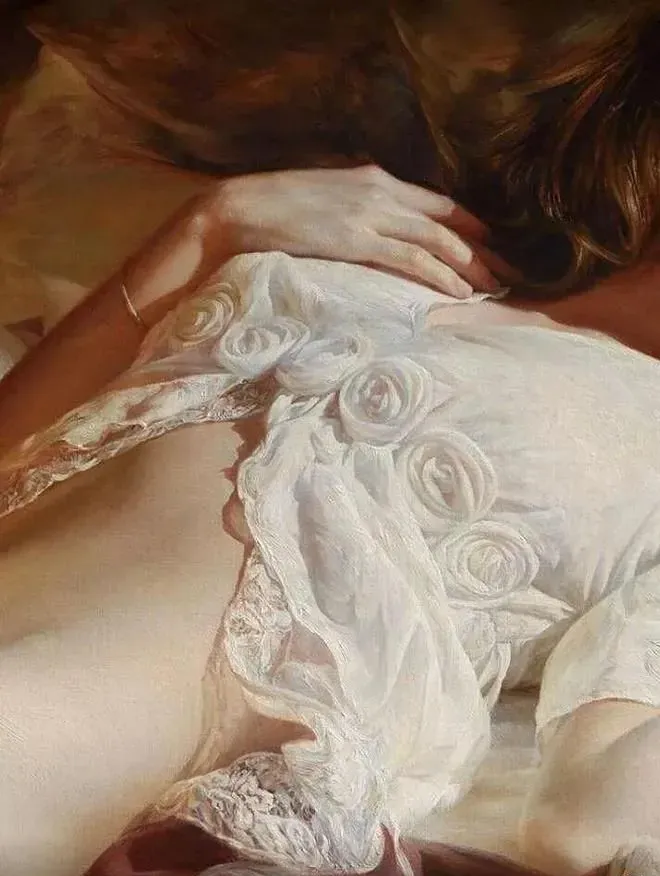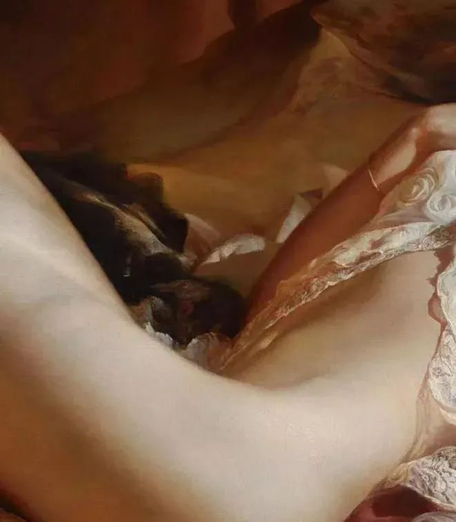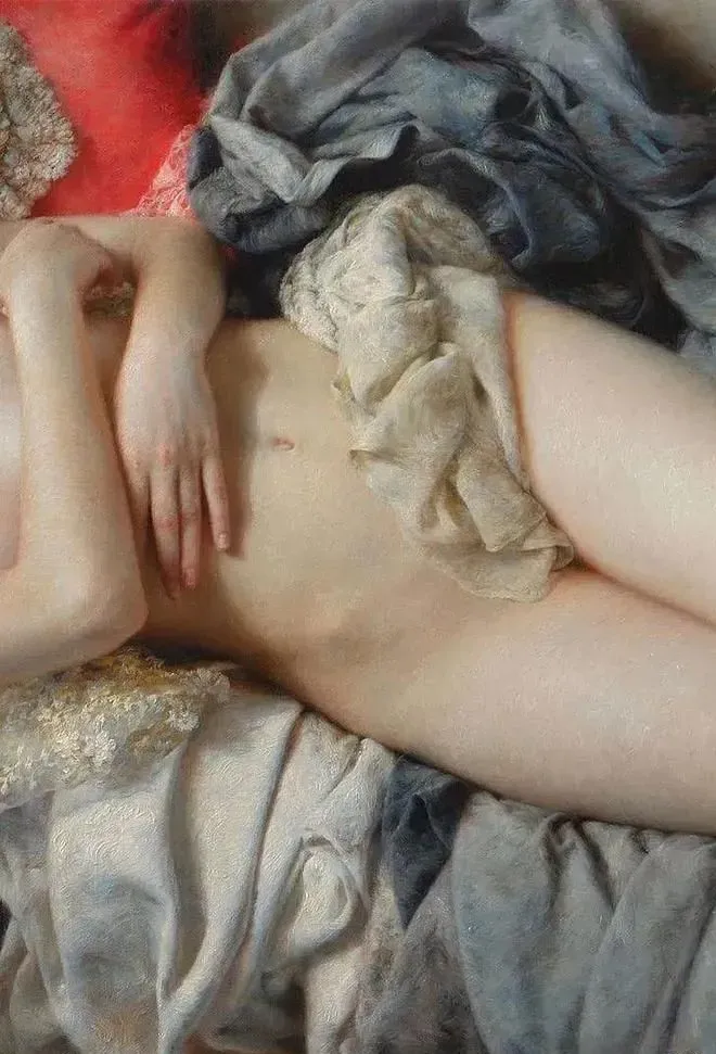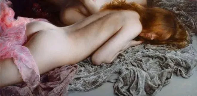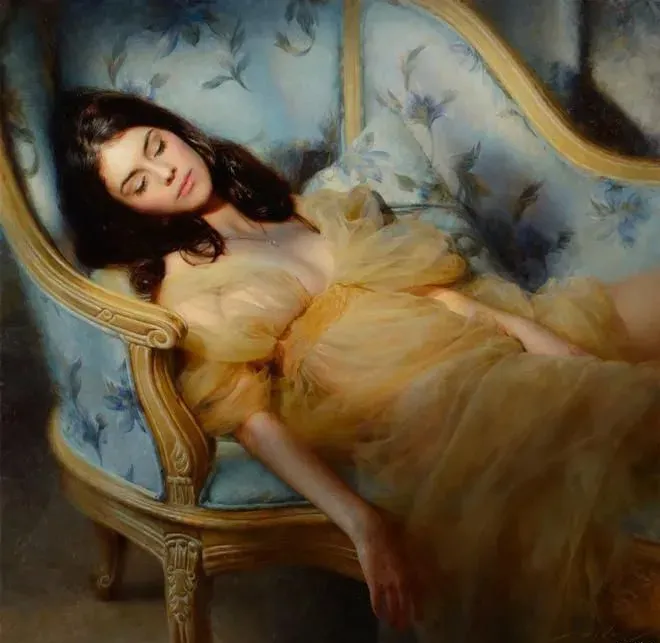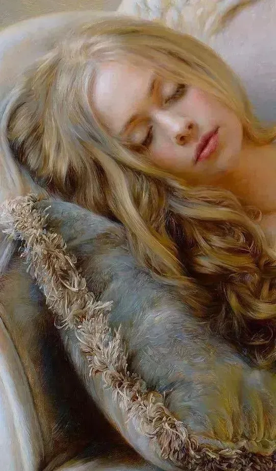 看到上面的这幅油画作品后,相信大家也被画中的女子所吸引吧?只见画中的女子静静的侧躺在床上,一头乌黑的头发,穿着一身蕾丝的睡裙,这种风格一看就是俄罗斯的女孩风格。