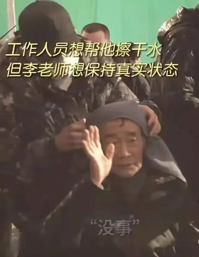 工作人员想帮他擦干,但浑身湿透、冻得发抖的他,只淡淡说了一句“没事”。