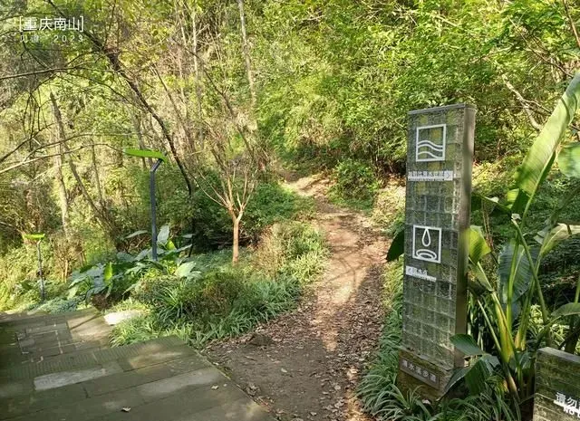 2、沿步道往上走,经过一碗水后,在即将到达民国建筑时,左侧有台阶往上,这上面有个平坝,旁边岩壁上有山泉水。路口有路牌指示“ ↑ 接水处”(即由此上去),这条道只通到接水的地方。