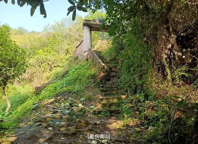 顺着这条陡峭的小道往上走,不一会儿就能看见有个台阶上面是个废弃的院门。