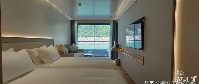 私人观景大阳台, 房间内配有干湿分离卫生间。客房最大程度隔绝振动和噪音困扰,接近全静音状态。