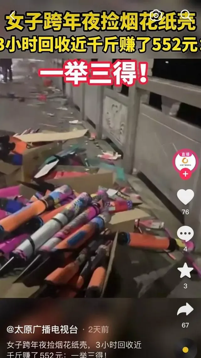 或者你可以像这位大姐,别人放烟花,她捡垃圾壳,既看了烟花,又环保,还赚到了钱,赢麻了。
