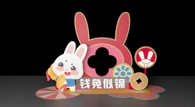“你听锣鼓响一片,声声送旧年”扬眉兔气打卡点整体造型活泼可爱,融入锣、金币等元素,祝福大家都能在新的一年财运亨通~