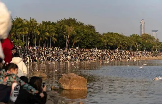 阿念在元旦当天补班结束后,来到了深圳湾。“人好多,可以用水泄不通来形容。”