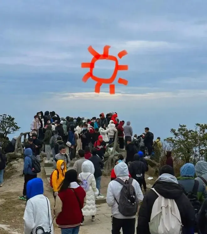 到了山顶上,已经有很多人在等待了,“人陆陆续续地来,目测有上千人。”大家都席地而坐,缩成一团,等待新年的第一场日出。