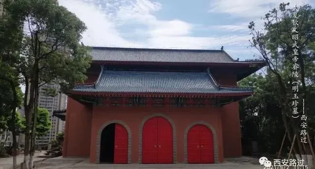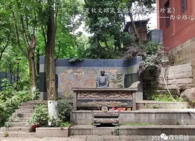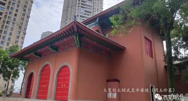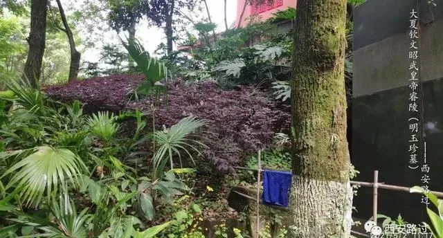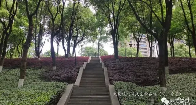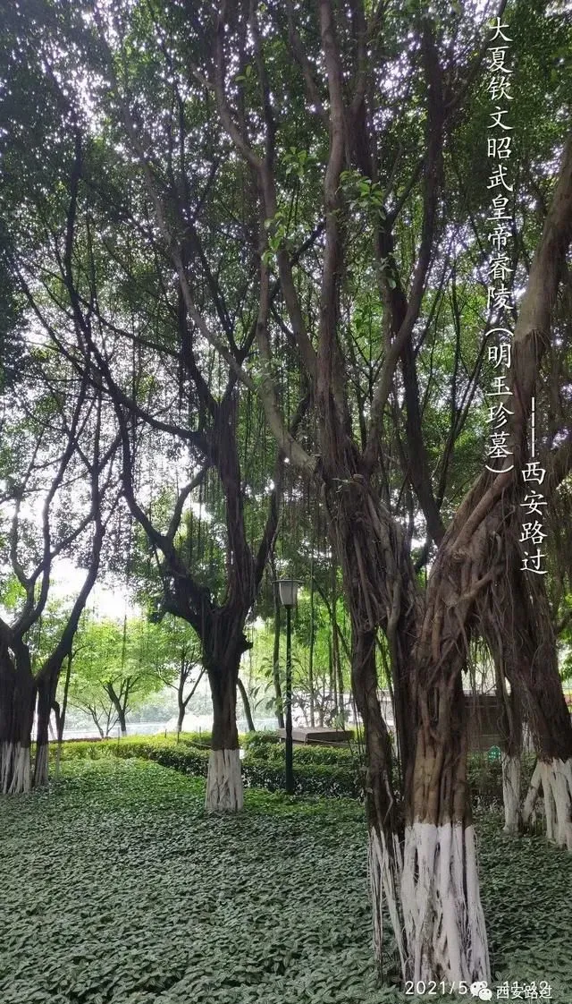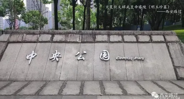 中央公园修的不错,芳草如菌,公园北侧一处山坡更是林木茂盛,期间多处道路通往山顶,远远向山顶望去,树林间透出一幢红墙碧瓦的古建筑,感觉这里就应该是明玉珍墓,连忙打开手机定位,原来确定无疑就是大夏钦文昭武皇帝睿陵。只是这里公园石刻上却标注为中央公园,且在地图上也无显示,自然怀疑自己找错了地方,如是连问好几个游人,多不知道这里是什么情况,更搞不明白这里到底是公园还是皇陵所在?