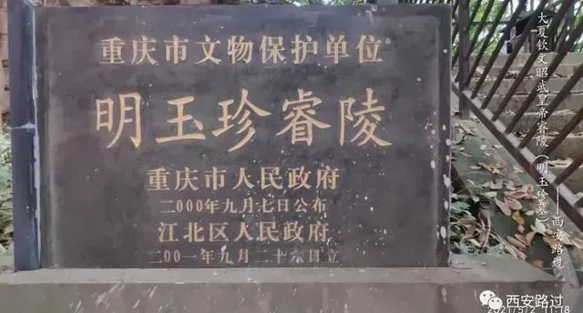 据资料显示,一九八二年三月三十日,在重庆市江北区上横街洗布塘的重庆织布厂基建中,无意间发现的明玉珍墓(睿陵)。而墓当时就没有修建墓道,墓室为长方形穴石坑墓,墓坑东西长5.4米,南北宽3.5米,坑之上部为泥沙层,下部为原生沙岩层,岩质坚硬。因山势倾斜,墓坑岩石呈前浅后深状,前壁高2米,后壁高3.2米,在椁前有一长方形石坑,用以竖立“玄宫之碑”。玄宫之碑系砂质,色青,用独石制成。而陪葬之物也很少,出土文物中有铭旌、画幡、棺帷、金银器和丝织品。其中金银器有金盆一只、银锭两枚,说白了就是埋了一只金碗和两枚元宝,比汉朝一般地主家的墓冢陪葬品都不如。