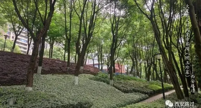 在地图上显示这里就已经是“明玉珍”墓之所在,询问无果我就只能向高处爬,虽然说这里是一座小山,其实并不高,也就二十来米的样子,附近的许多大楼都比它高的太多。穿过草坪,从石阶路上的山顶,来到仿古建筑前,结果是围绕着这栋建筑竟然被用彩钢板围绕着不让进,原来此处正在进行整体大修。我爬上边上小树向里张望,看见就是一些现在的水泥复制的古建筑,也就没有了兴趣,环伺四周一圈,看见西北角山坡下有些行人和一个环卫工人,复跑下山去,向环卫工打听情况。