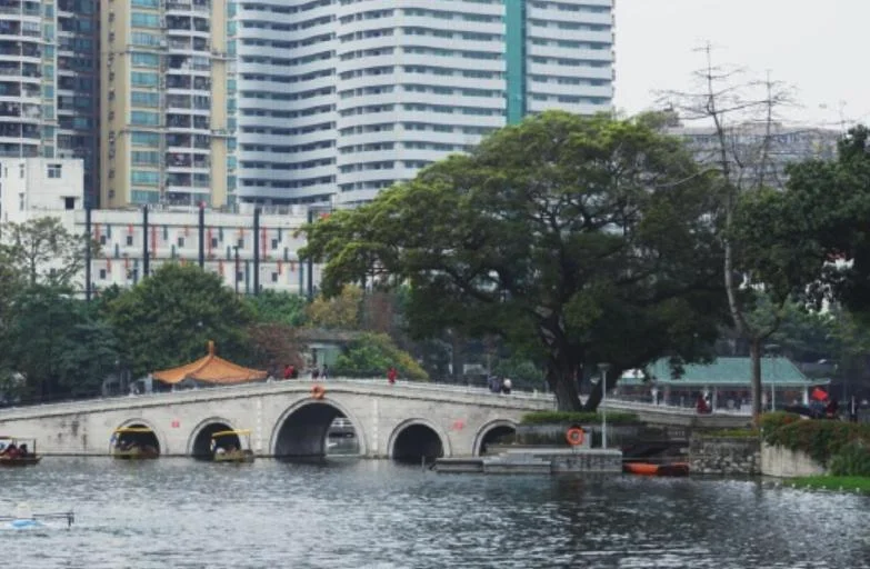 荔湾湖公园荔湾湖公园建于1958年,东至龙津西路,南至西关口,西至黄沙大道,北接中山八路,该地曾大量种植荔枝。园内设有餐厅、茶座、舞厅及多种游乐设施,成为集游览、文体、娱乐、休息为一体的综合性公园。荔湾湖公园是最能体现南国优雅柔美风情、以湖为主的公园。湖面占三分之二。由小翠湖、玉翠湖、如意湖、五秀湖四个湖组成,游客可乘坐出租小艇、水上单车游览。