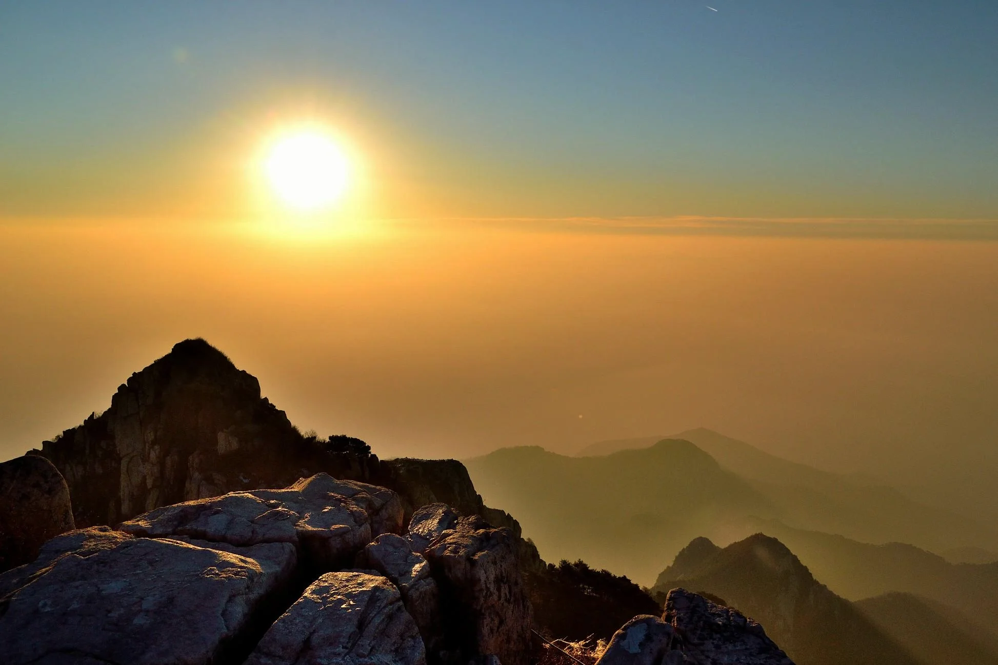夜爬泰山就是为了次日登顶之时能够欣赏到日出。从山脚拾级而上,行走6000余级阶梯,当走到玉皇顶时,天刚刚微微亮,红日从东边慢慢升起,观日出云海,仿佛置于仙境之中,站在山顶有种“会当凌绝顶,一览众山小”的感觉。